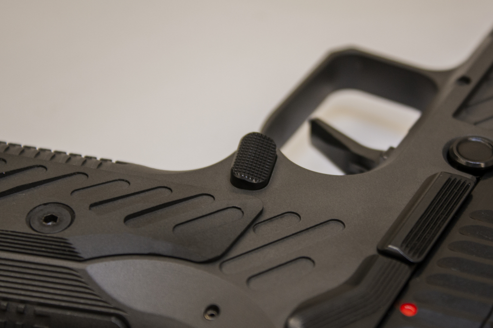 Magazine catch optimally shaped and checkered for universal use. Suitable for the right and left side of the pistol.
